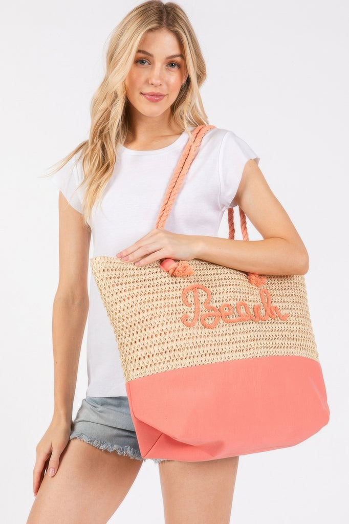 Design: The "Beach" lettering paired with crochet fabric and sewn rope handles creates a stylish, beachy vibe that's perfect for warm-weather outings.