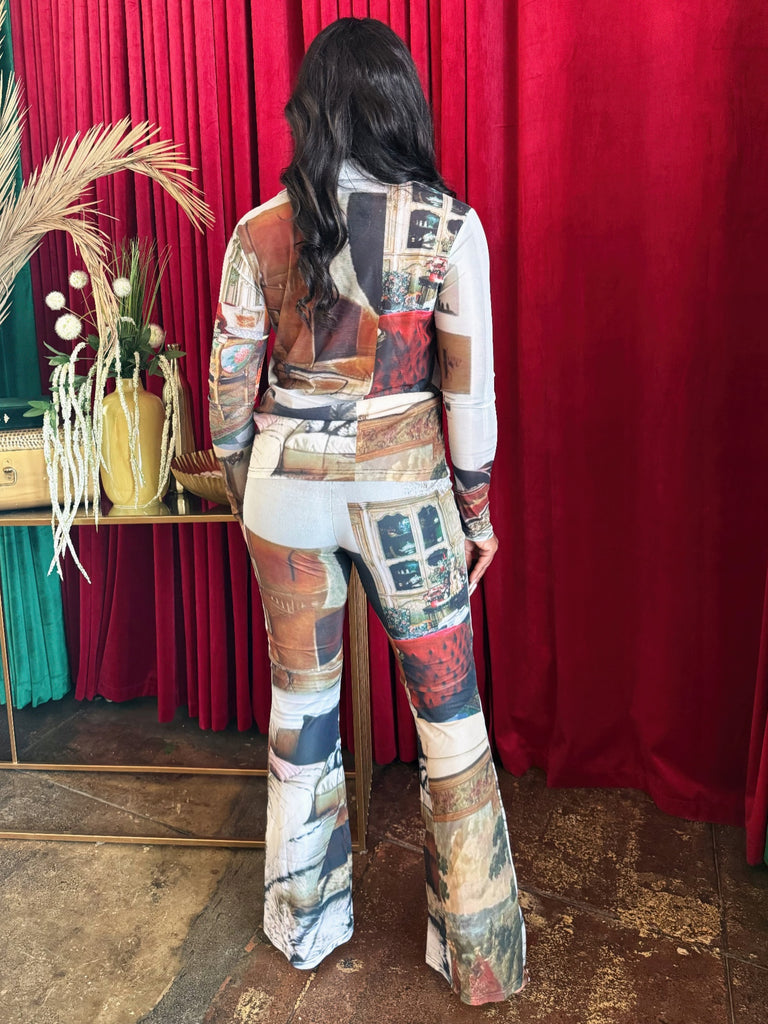 Make an artistic statement with the Gallery Muse Button-Down Set, a vibrant fusion of modern edge and elevated elegance. This art-inspired ensemble features a fitted mesh button-down shirt with a plunging neckline, paired with high-waist flared pants that create a sleek, leg-lengthening silhouette. The bold museum-style patchwork print transforms this set into wearable art, combining confidence with effortless sophistication. Perfect for gallery events, rooftop lounges, or stylish nights out, it’s a showstopping look made for standing out.