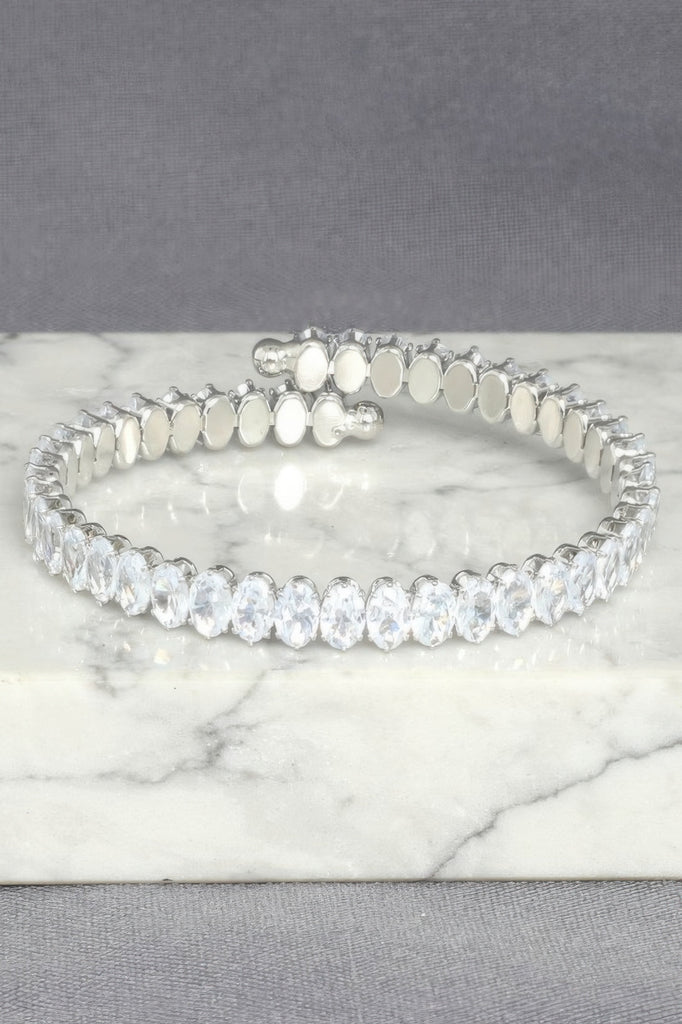 Elegant and timeless, this White Gold Plated Tennis Bracelet showcases a series of oval-cut cubic zirconia stones set in a classic, refined design. Crafted for special occasions or everyday sophistication, it delivers brilliant shine with a lightweight feel. The sleek, uniform setting enhances its upscale appeal, making it a standout accessory for weddings, formal events, or romantic evenings. With its graceful profile and secure slip-on fit, this bracelet is a beautiful gift and lasting keepsake. Whether for bridal wear or a formal celebration, it adds a polished touch to any look.